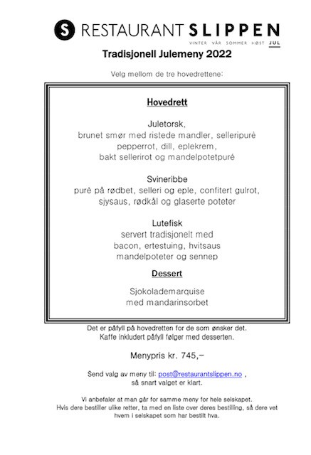 I år igjen har styret gleden av å invitere til Julebord på Restaurant Slippen.