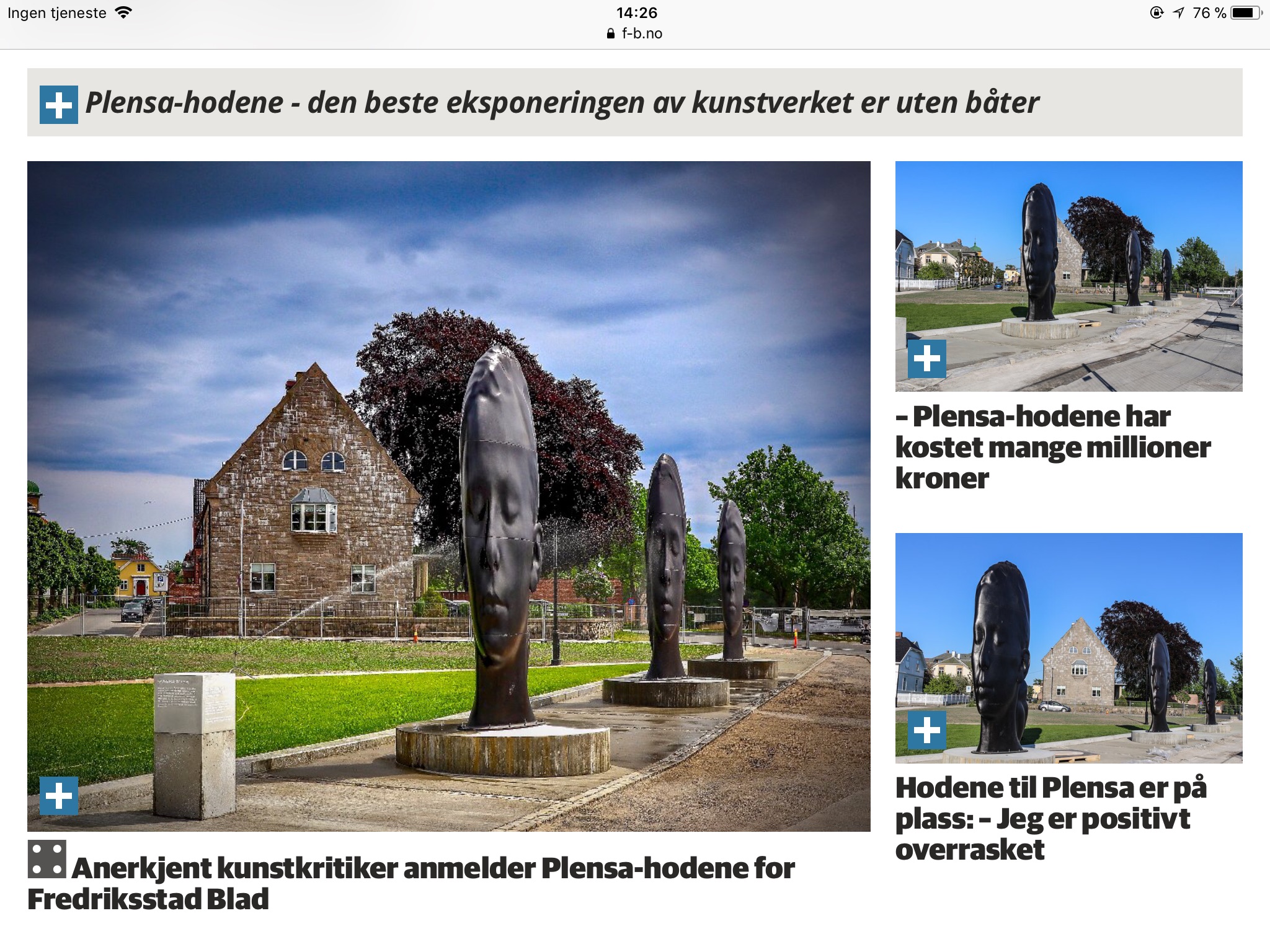 DEBATT: Plensa-hodene - den beste eksponeringen av kunstverket er uten båter DNB-stiftelsen har gjennom et prosjekt de kaller «Kulturstopp» gitt Plensa-hodene i gave til Fredrikstad kommune. Kunstneren selv, Jaume Plensa, har bestemt at kunstverket skal plasseres på Phønixbrygga, som dermed blir en del av kunstverket. Plasseringen syd for biblioteket er god, siden området er åpnet opp og forvandlet til et grøntanlegg som forlenger parken rundt biblioteket. Hva med båtene som ligger fortøyd langs Phønixbrygga foran kunstinstallasjonen? De fremstår nå som fremmedelementer som ødelegger – og til dels skjuler – innsynet til kunstverket. Passasjerene på byfergene, så vel som de som ferdes på Kråkerøysiden, får ikke den opplevelsen av kunstverket som de burde ha fått. Da Fredrikstad kommune besluttet å endre Phønixbryggens funksjon til park, må det antas at båtenes fremtidige havneplass ble vurdert. All sunn fornuft tilsier at båtene må tilbys havneplass andre steder, slik at eksponeringen av kunstverket optimaliseres. Kai-fronten langs hele Phønixbrygga bør være «ren», uten båter og gamle bildekk. Lars Carlheim Kråkerøy